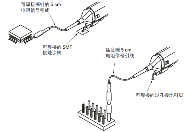 例如: 1156A/57A/58A 探頭提供了 5-cm 和 10-cm 電阻信號(hào)引線,用于幫助探頭在狹小空間進(jìn)行探測(cè)(圖 -10)。這些信號(hào)引線包含電阻探針,可以使探頭寄生效應(yīng)和被測(cè)電路隔開,并抑制諧振電路的形成。