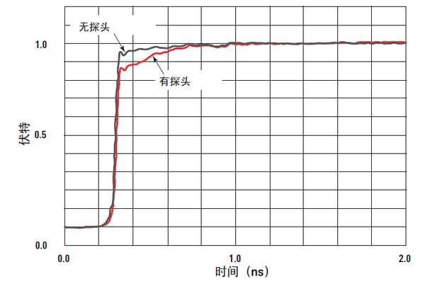 圖 5. 探頭在高頻條件下造成電路負(fù)載并且延長(zhǎng)電路產(chǎn)生全電壓的時(shí)間。